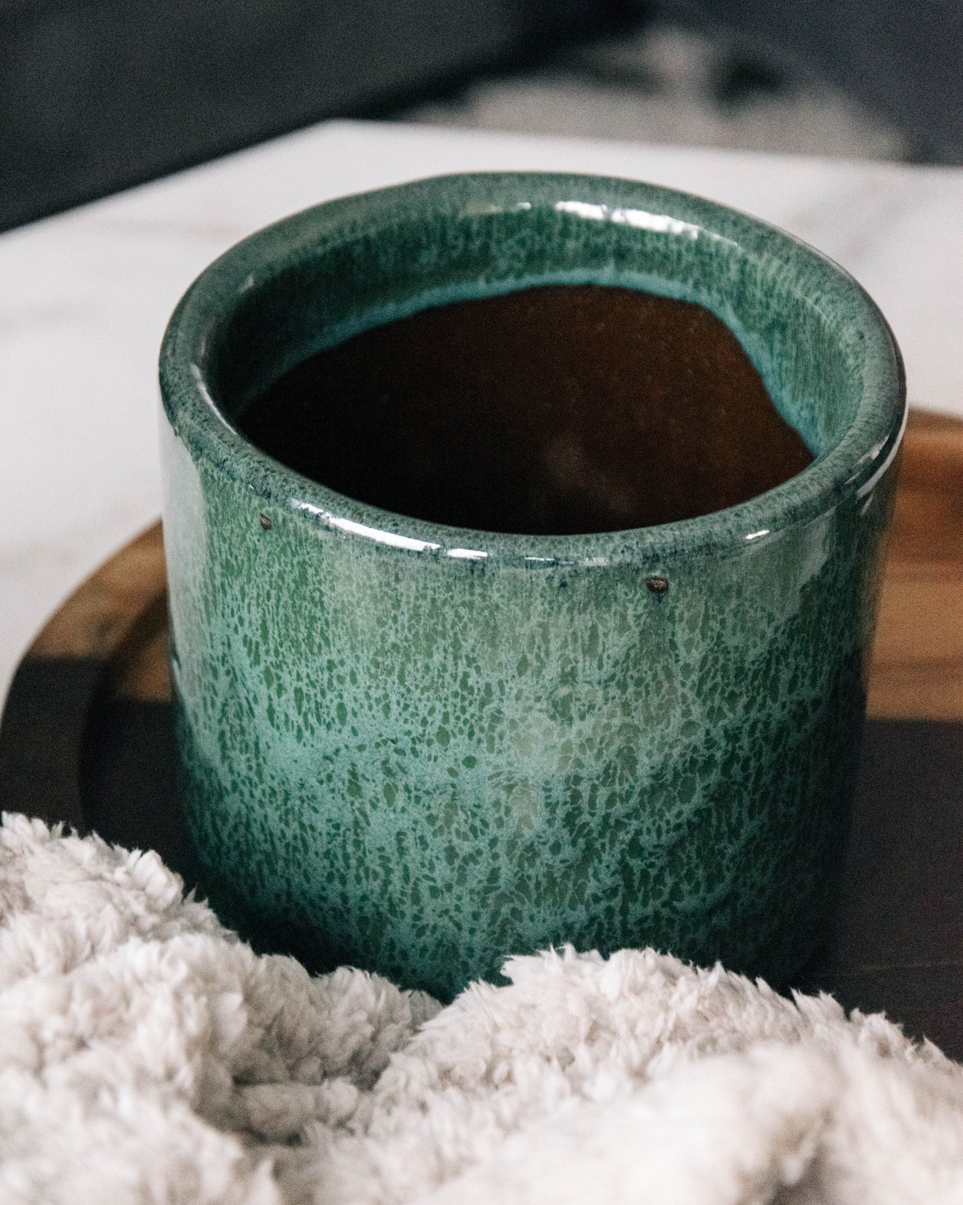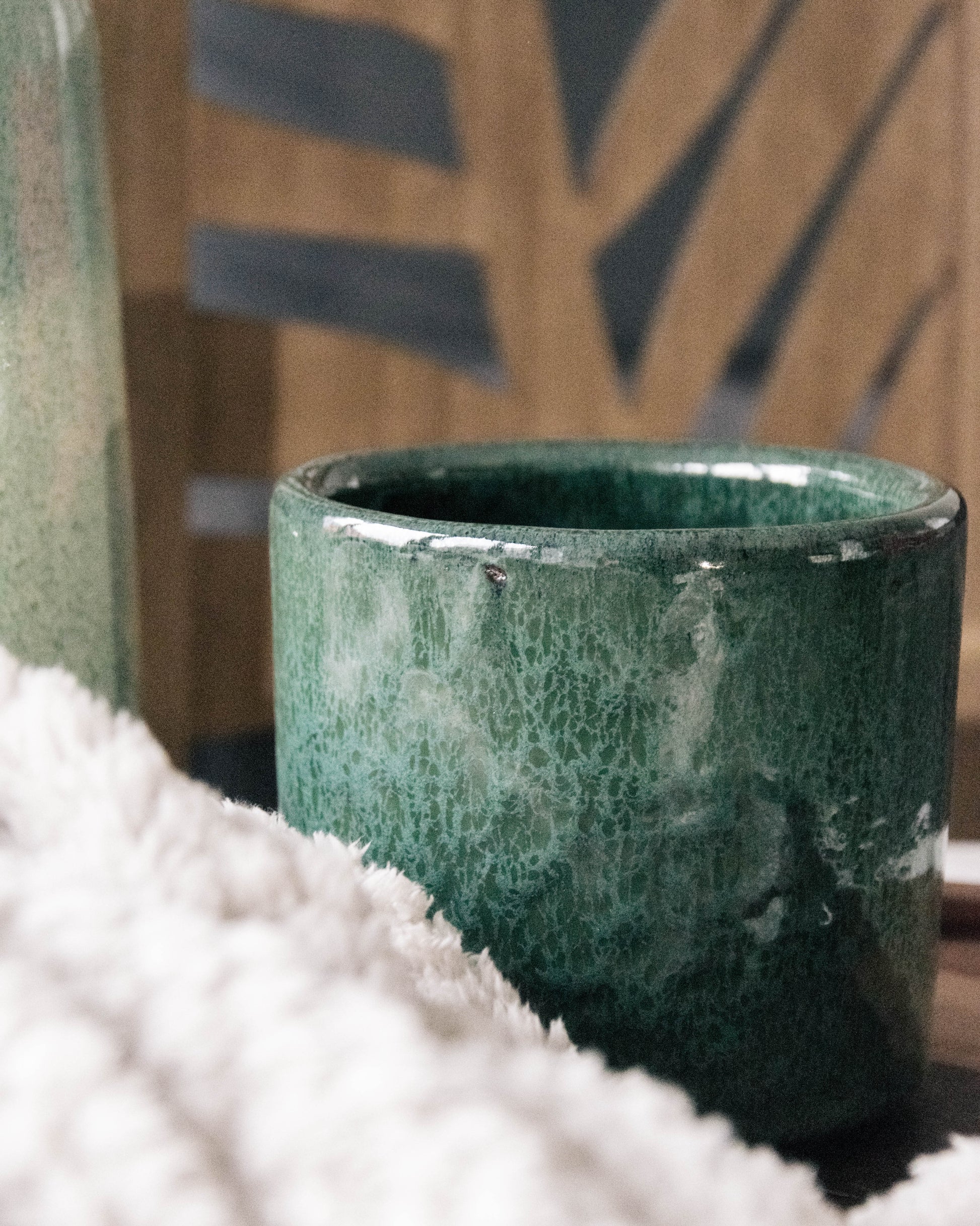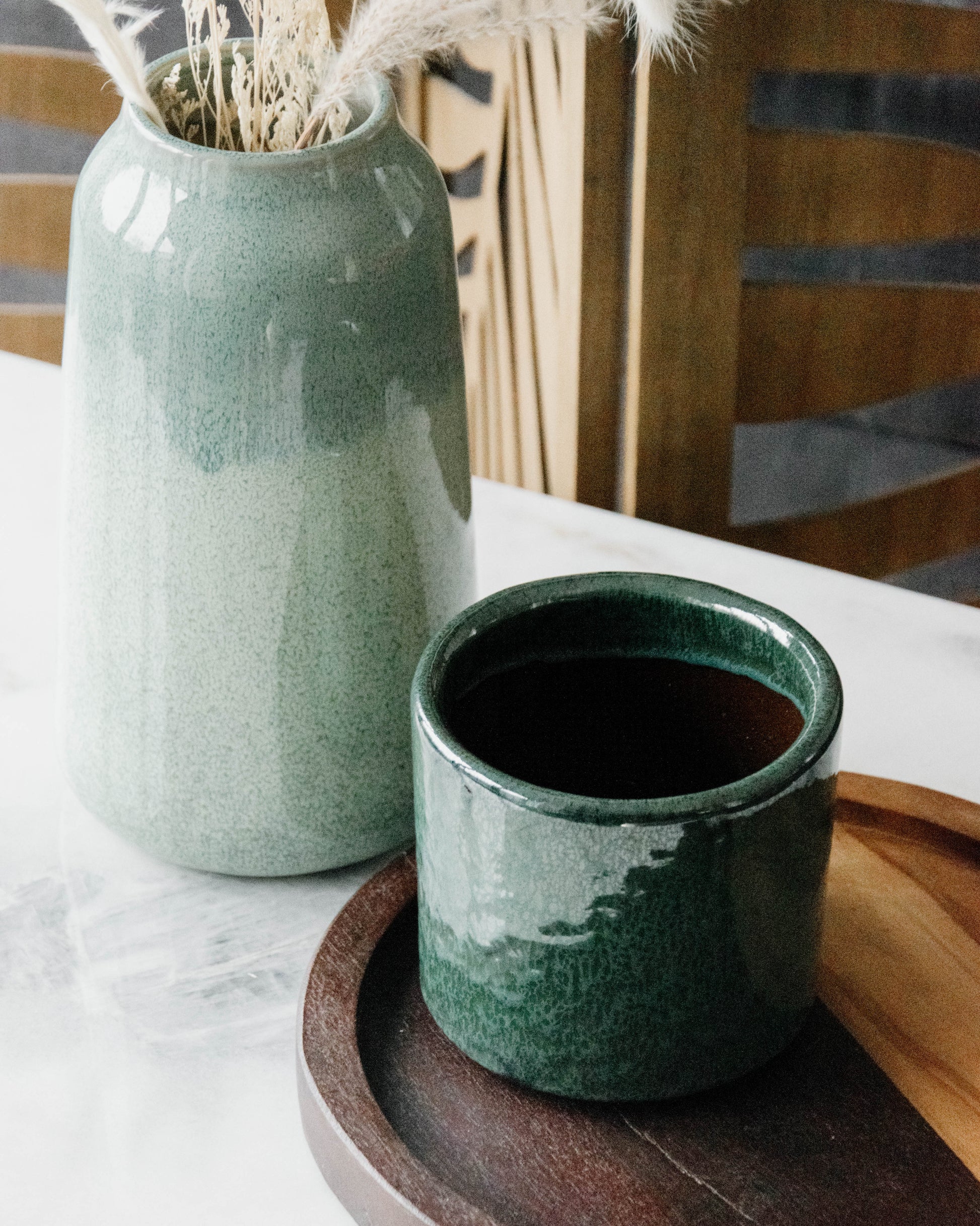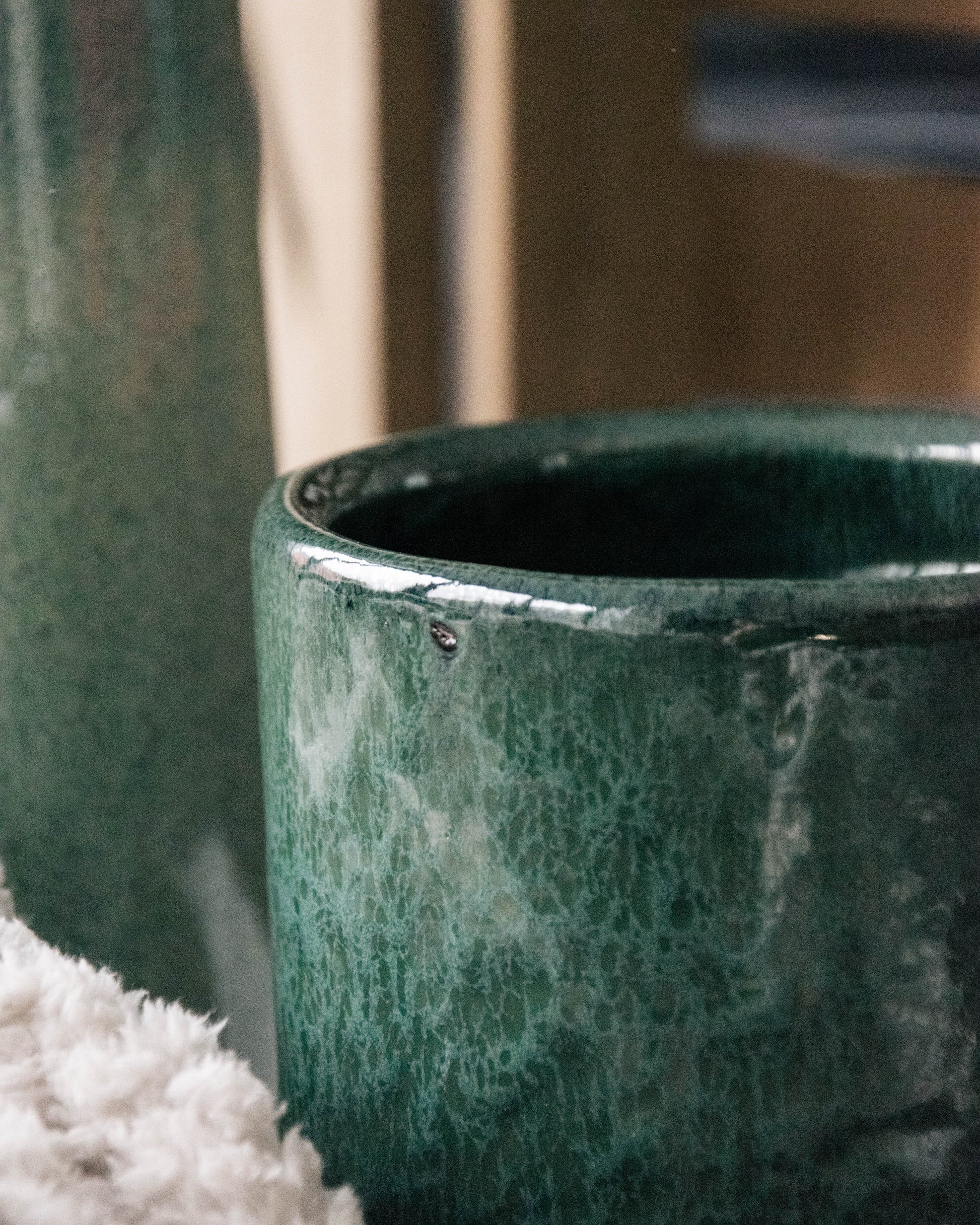 Groenkleurige bloempot in keramiek. Rustieke look door de unieke structuur in het glazuur.