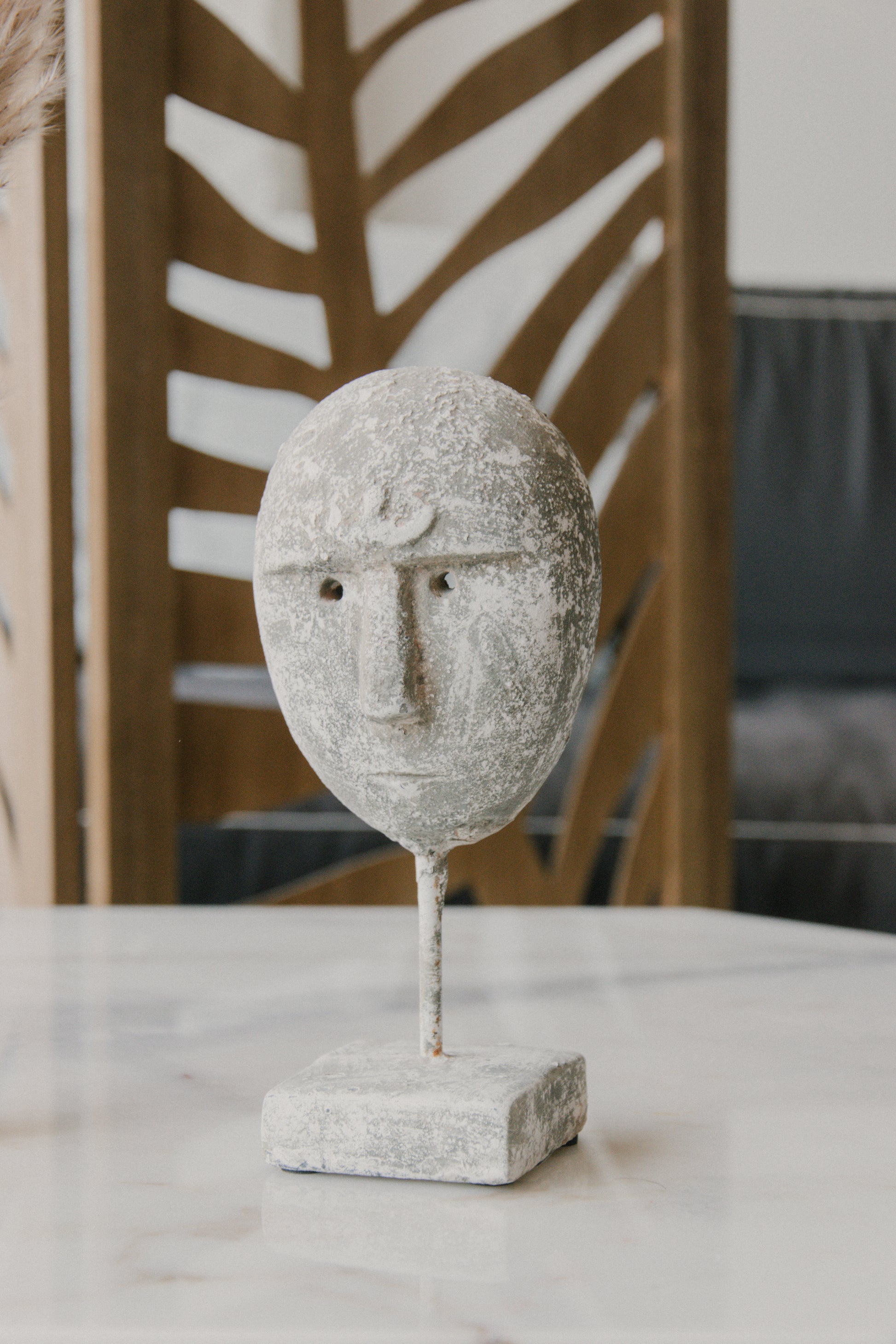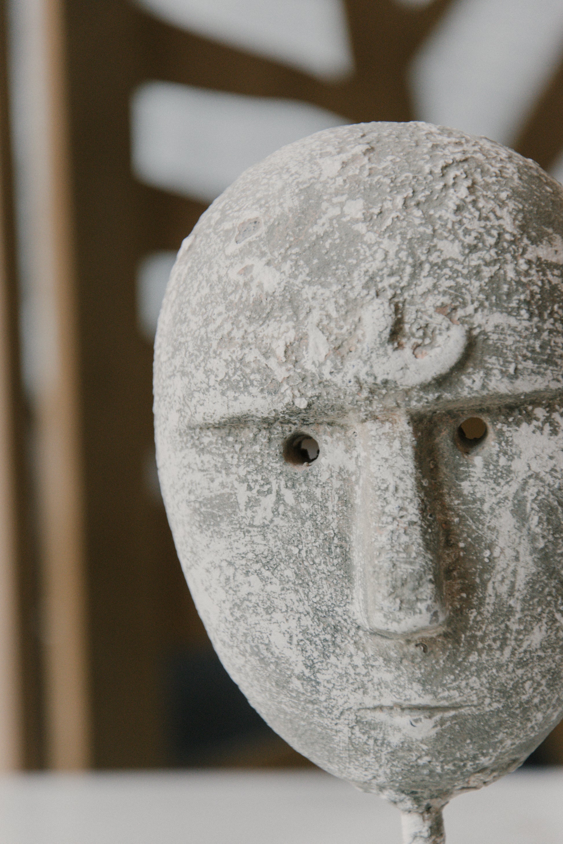 Klein metalen ornament in de vorm van een masker – subtiel en decoratief. Het heeft een ruwe, matte afwerking die het net dat beetje karakter geeft, zonder te opvallend te zijn.