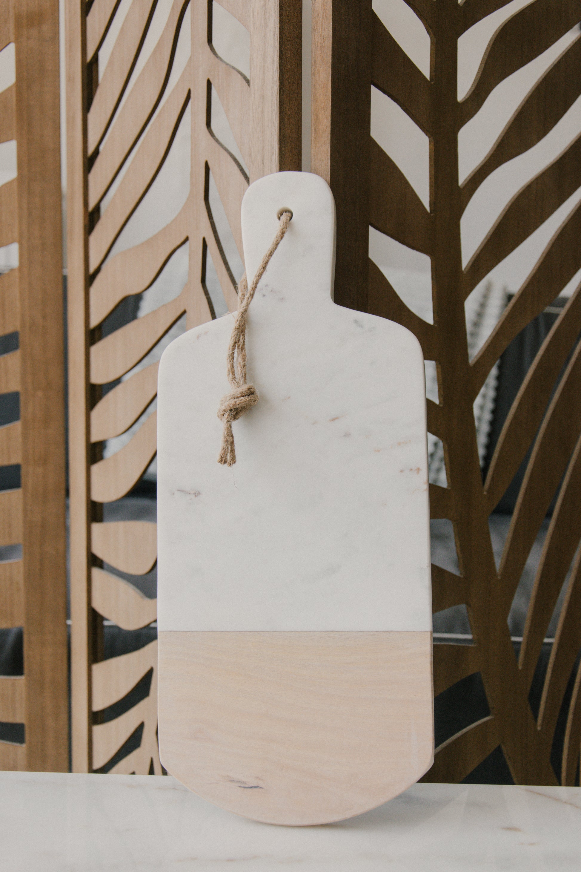 Deze tapasplank combineert licht hout met koel wit marmer – een tijdloze mix die altijd werkt. Het handvat met touw zorgt voor een ambachtelijke toets en maakt het makkelijk om te serveren of op te hangen in je keuken.