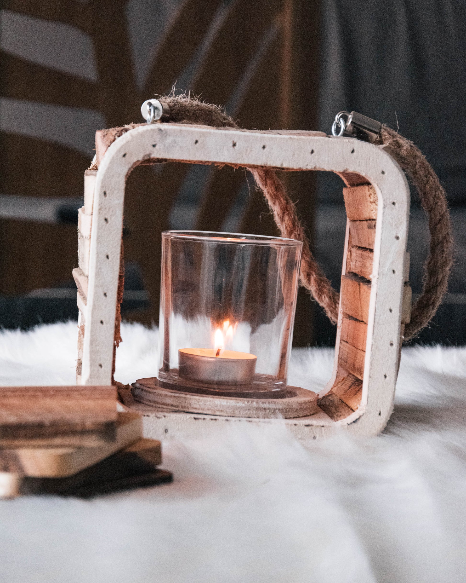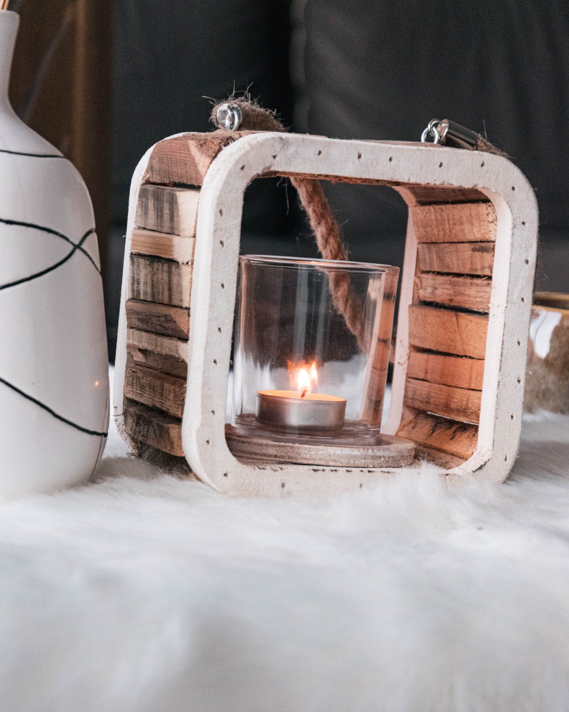 Ontdek de rustieke charme van onze houten theelichthouder, een subtiel accessoire dat een warme gloed toevoegt aan elk interieur. We raden aan om enkel gebruik te maken van een LED theelichtje in het voorziene glaasje.