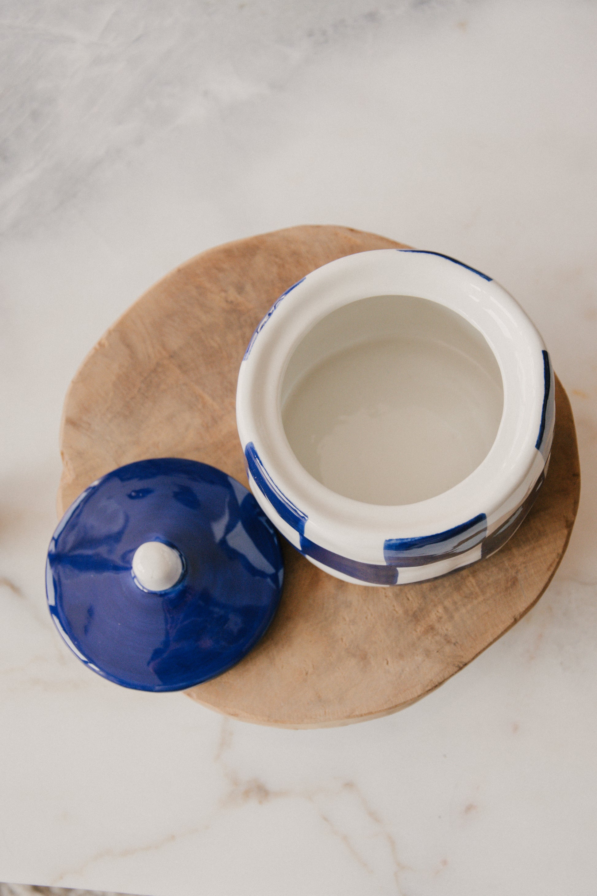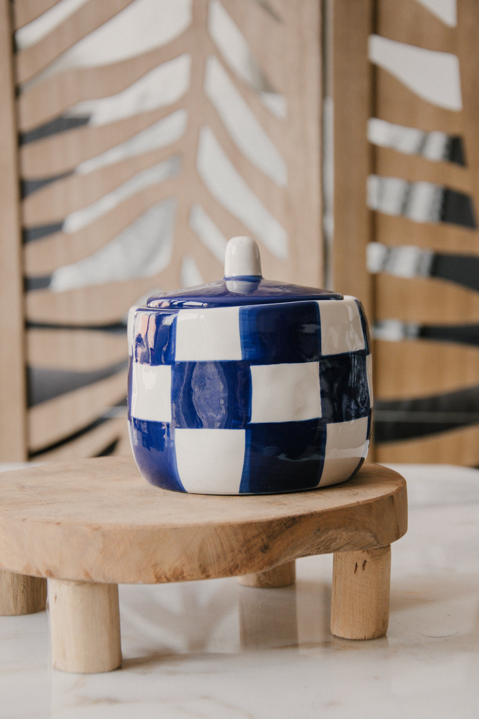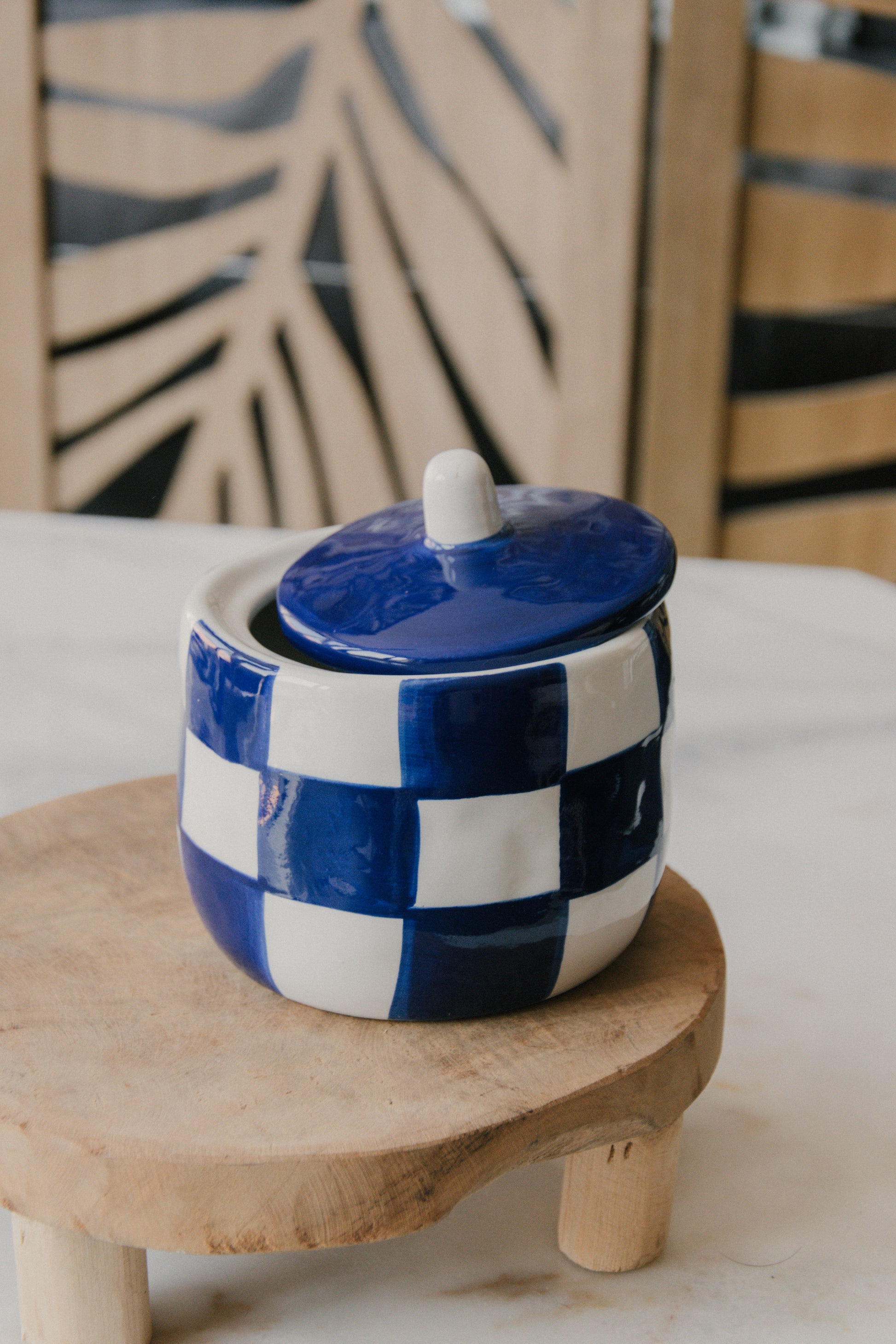 Keramieken voorraadpotje met een wit-blauw geblokte glazuurlaag. De glanzende afwerking geeft het potje een frisse, artisanale uitstraling – perfect voor in een open keukenkast of op het aanrecht.